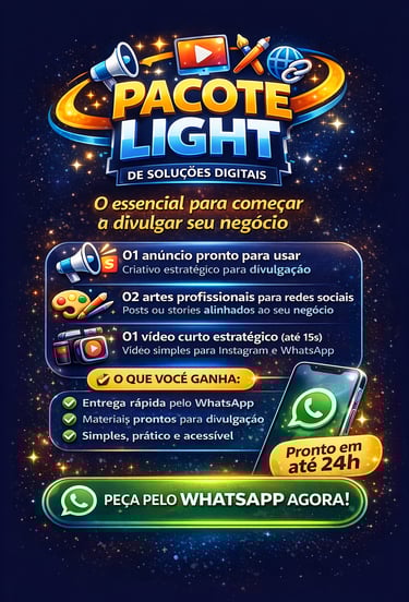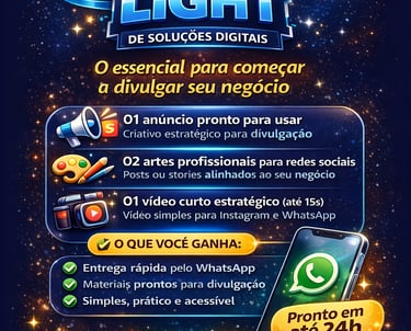 O Pacote Light é ideal para quem quer começar no digital de forma simples, rápida e profissional, com materiais prontos para divulgação.